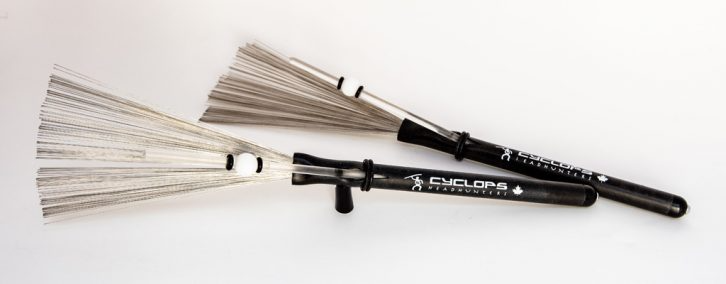 Rhino: Rhino incorporate an adjustable polycarbonate rod and a traditional non retractable wire brush. The rod used in the Rhino is heavier and stiffer than that of the Cyclops and there no nylon sleeves on the rod. When rod is engaged in or impacted in rims or cymbals the sound it very distinct. The larger rod has incredible reflex and therefore its rebound is extremely fast. Rod can be pushed in or out of the tube or removed altogether.